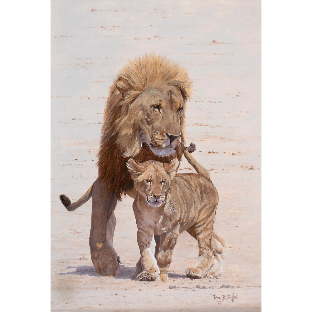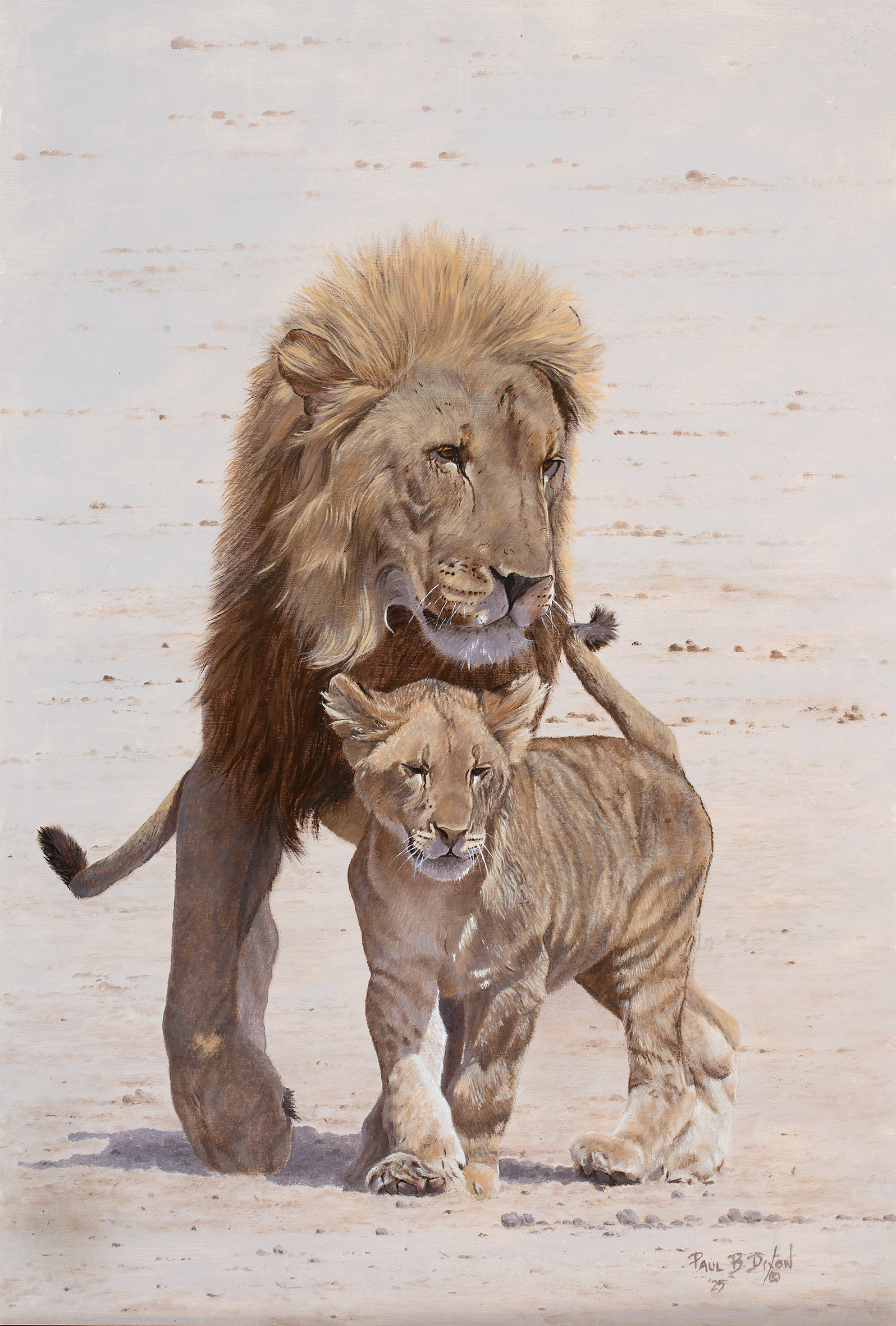 “After spending several days observing a lion pride consisting of a large male, three females and six cubs, I was finally rewarded with their appearance at the m’Bari waterhole. The three females had been at the waterhole for the whole morning, but without the male or the cubs. At about 1.30pm the male finally put in an appearance with the six cubs in tow, who were running around all over the place, making his life quite tricky! I isolated a moment in this episode and thus was born, ‘Daddy Day-Care’.” – Paul B. Dixon, wildlife artist