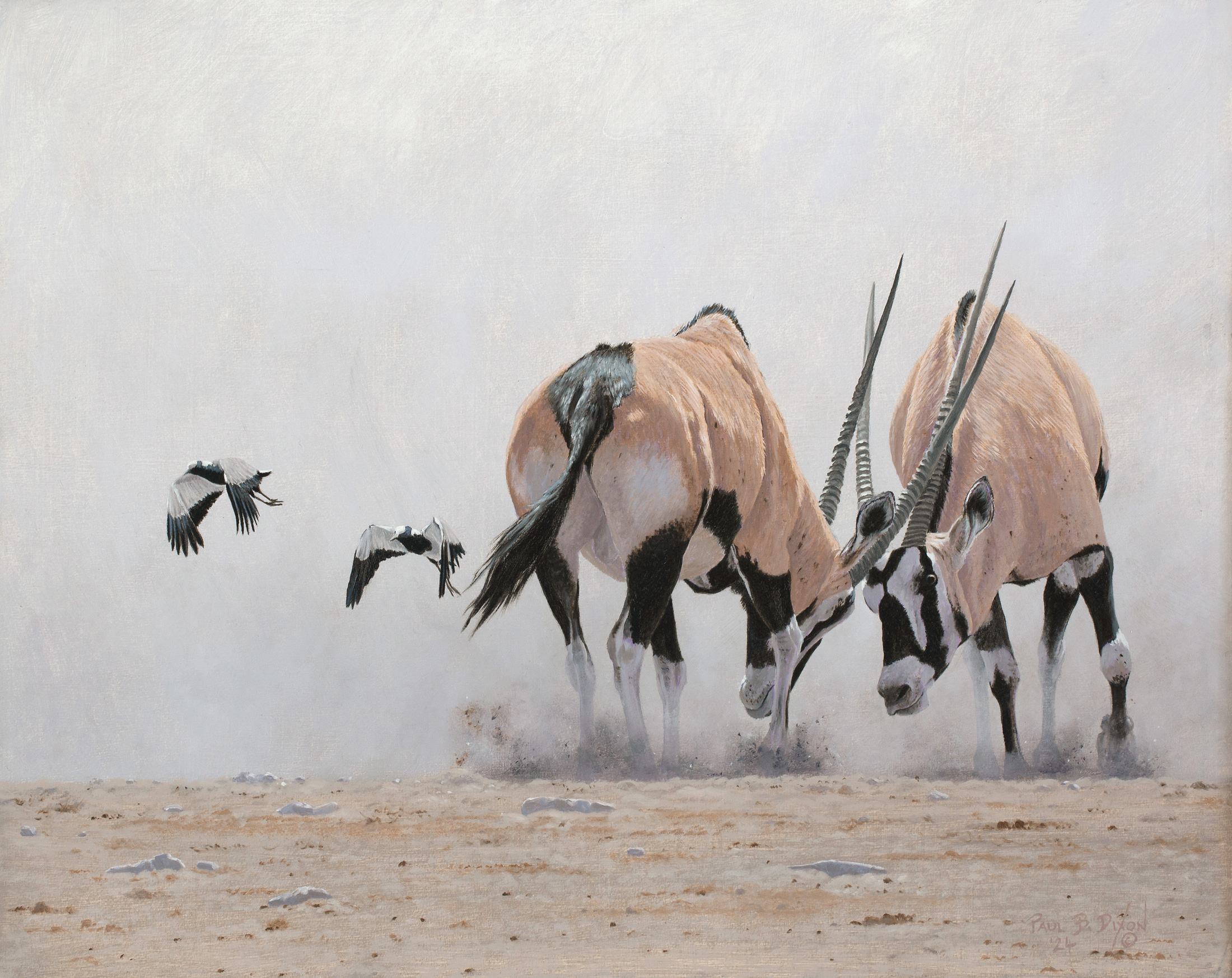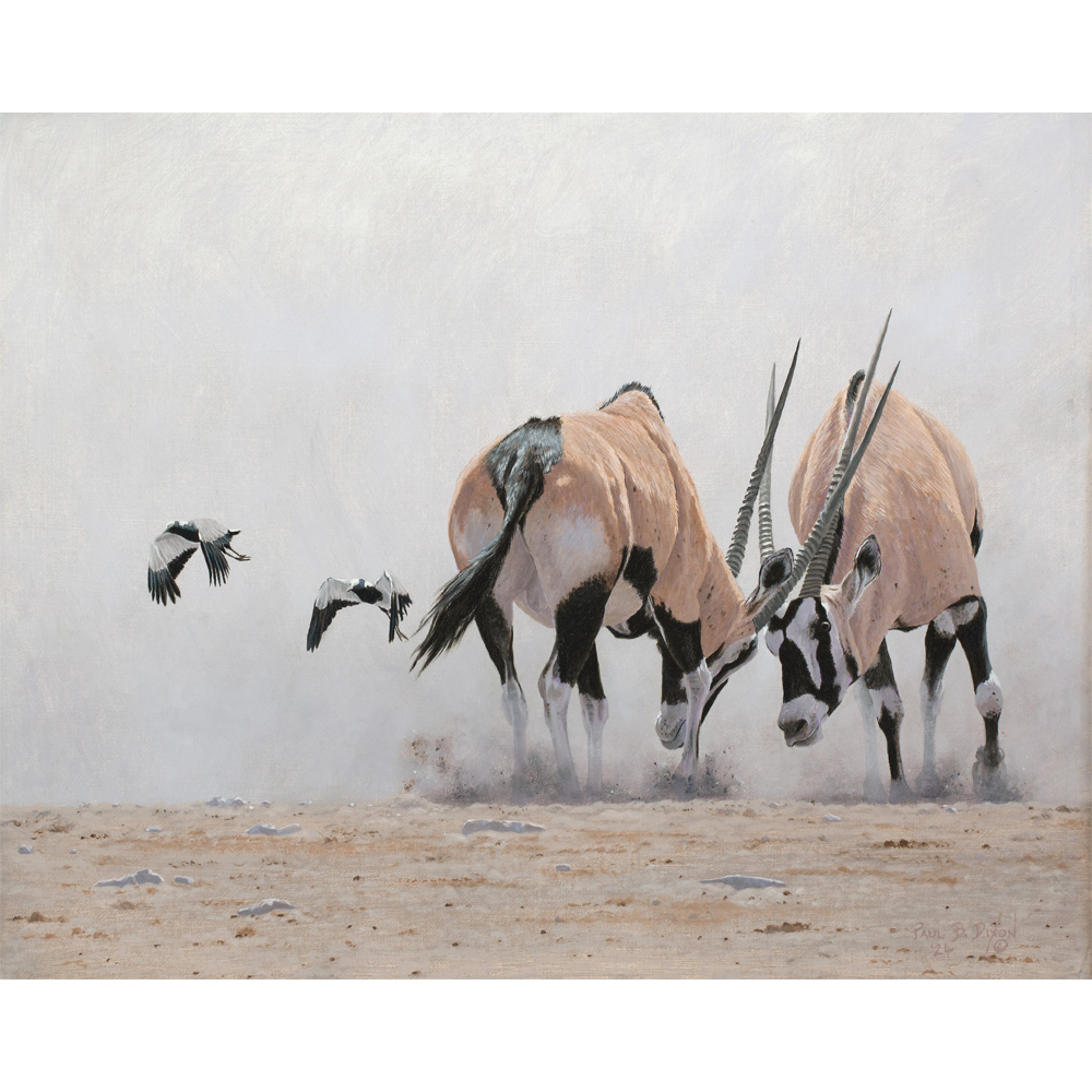“An argument breaks out between two male oryx and they set to with horns clashing, kicking up dust and disturbing a pair of blacksmith plovers (lapwings) who take to the wing to avoid further disturbance. These disputes among oryx are usually quite short lived and rarely result in fatalities although some serious wounds can be inflicted by their scimitar-like horns.” – Paul B. Dixon