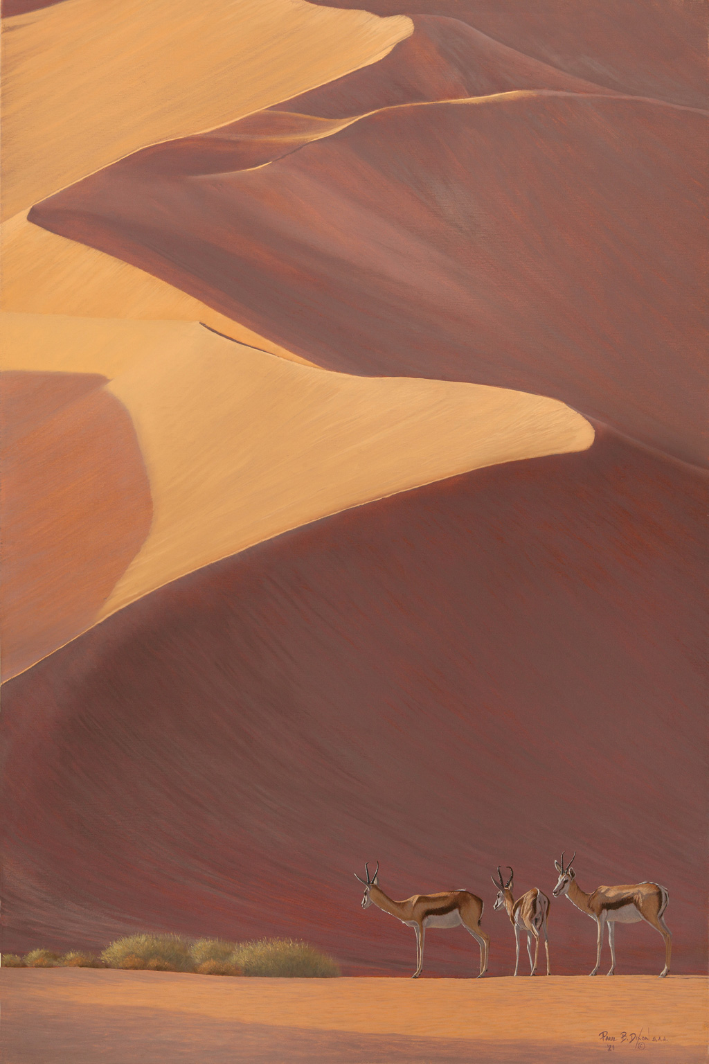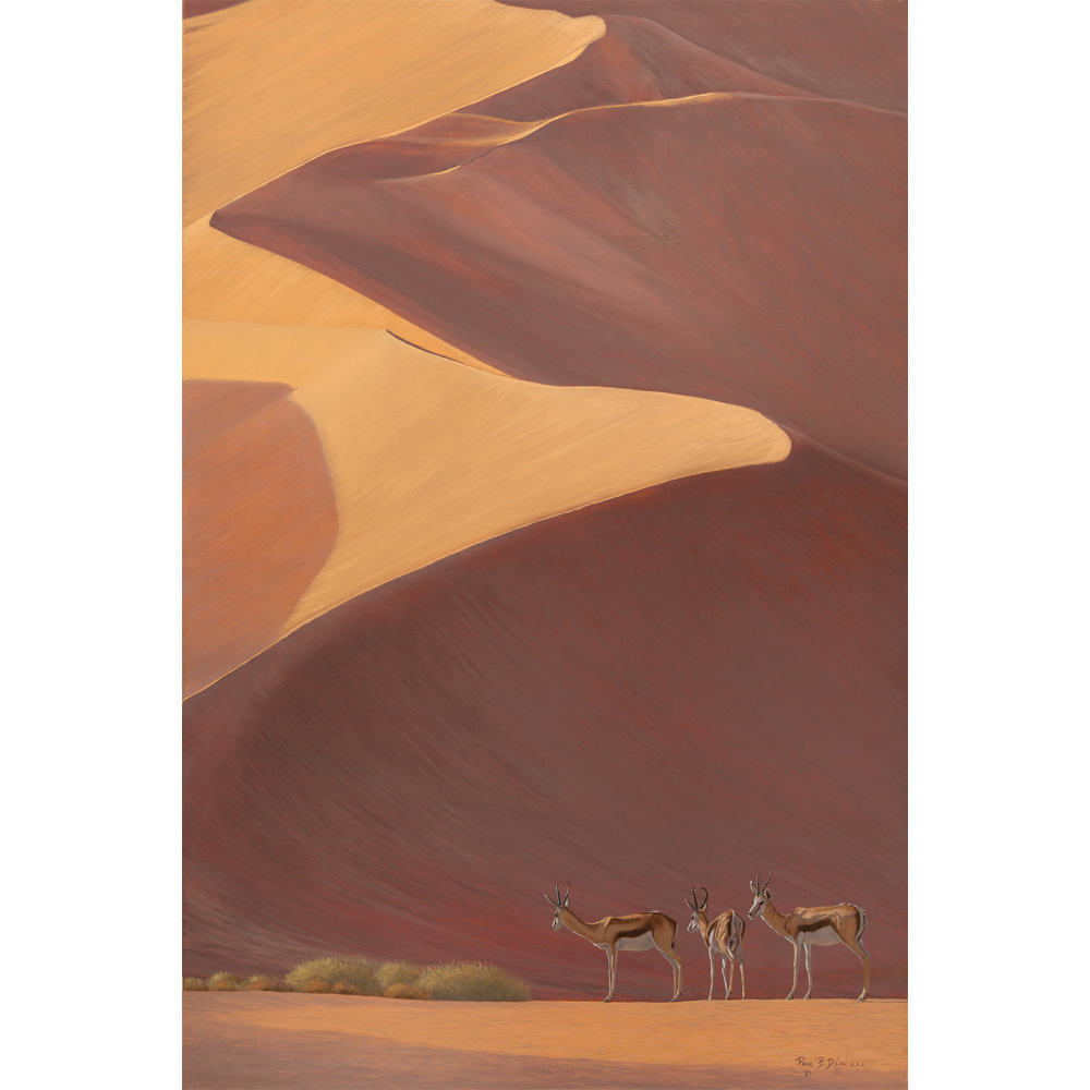 This is a limited edition archival print reproduction of ‘Sand, Silence & Shadows II’ by wildlife artist Paul B. Dixon. The original painting was done in oils on linen in 2021.